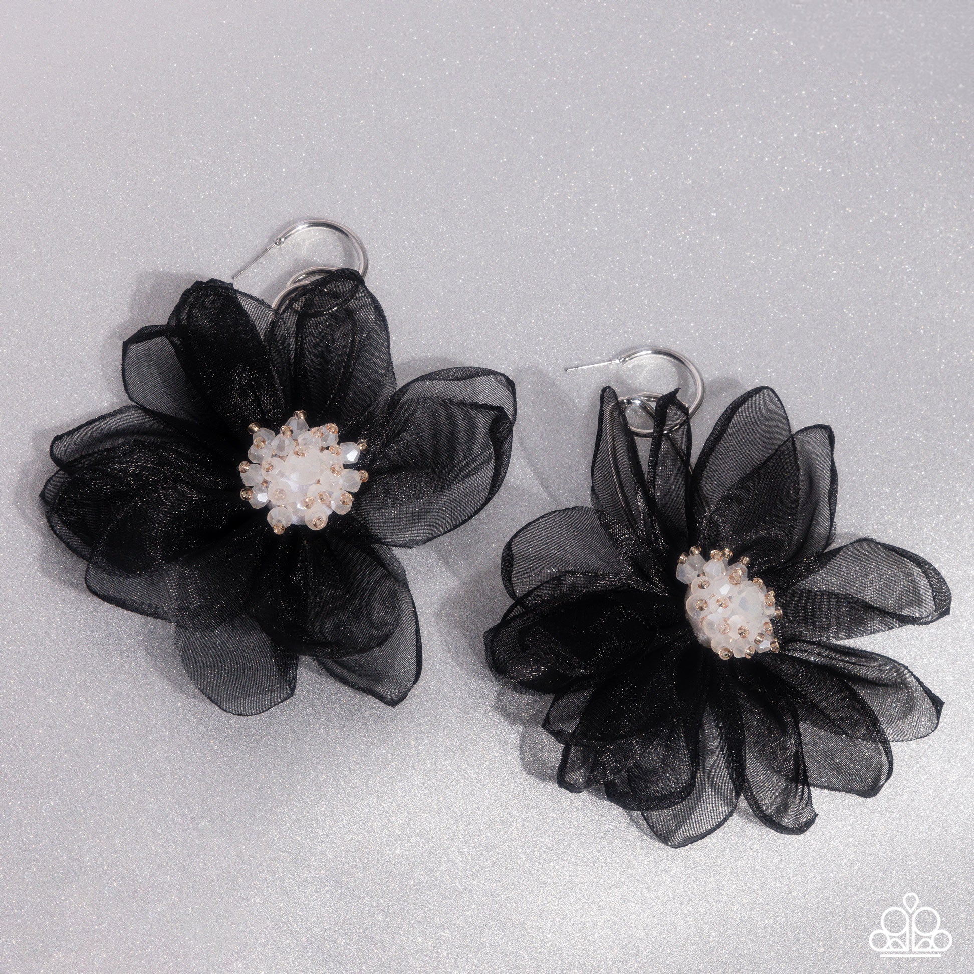 A duo of asymmetrical silver hoops link as they tumble from the ear, coalescing into an abstract lure. Attached to the bottom of the elongated display, oversized black chiffon petals bloom around opalescent-tinted beads, creating a fantastical floral frenzy. Earring attaches to a standard post fitting. Hoop measures approximately 1" in diameter. Due to its prismatic palette, color may vary.