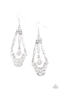 A trio of glassy white rhinestones gives way to hammered silver bars attached to a bubbly white rhinestone encrusted frame. Attached to a matching silver bar, a solitaire white rhinestone swings from the center, creating a timeless chandelier. Earring attaches to a standard fishhook fitting.