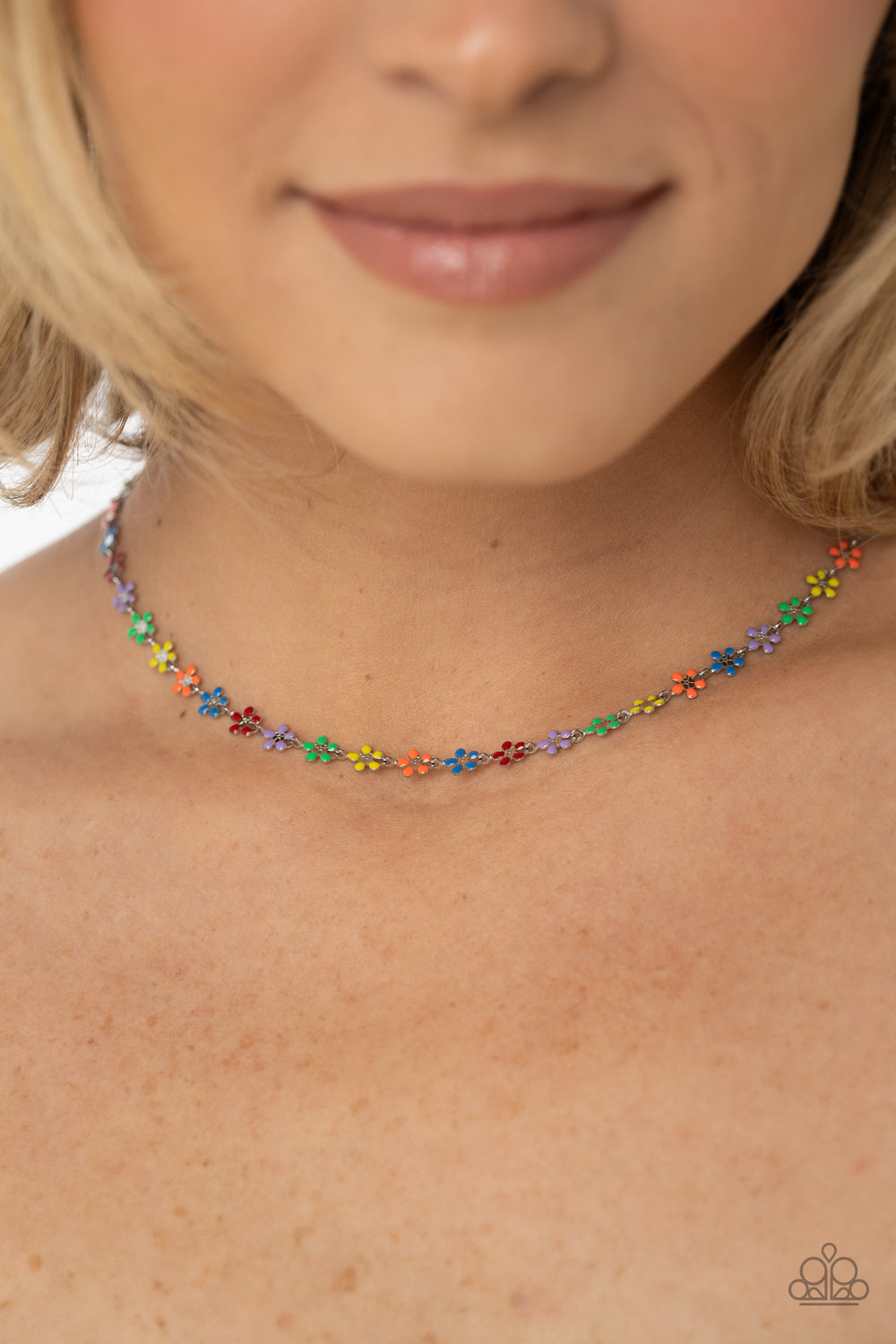 Dotted with dainty silver flower centers, colorful petaled flowers link below the collar for a colorfully seasonal look. Features an adjustable clasp closure.