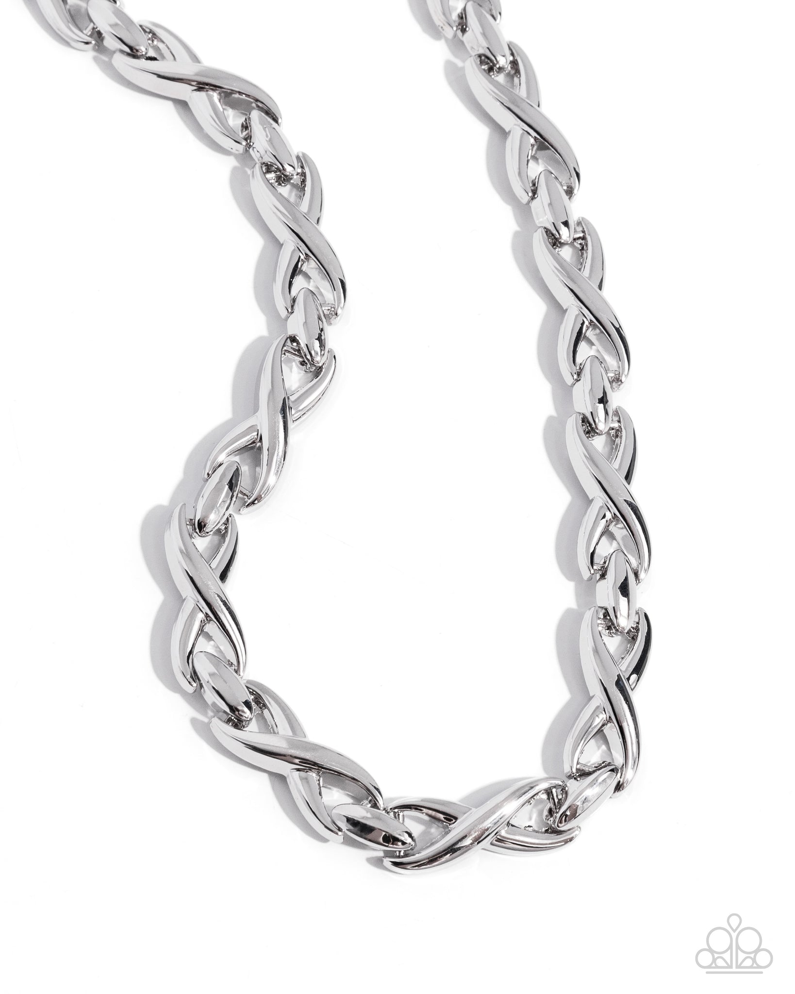 Featuring a high-sheen, silver links twist and curve into inifinity-like frames that delicately connect around the collar for an iconic look. Features an adjustable clasp closure.
