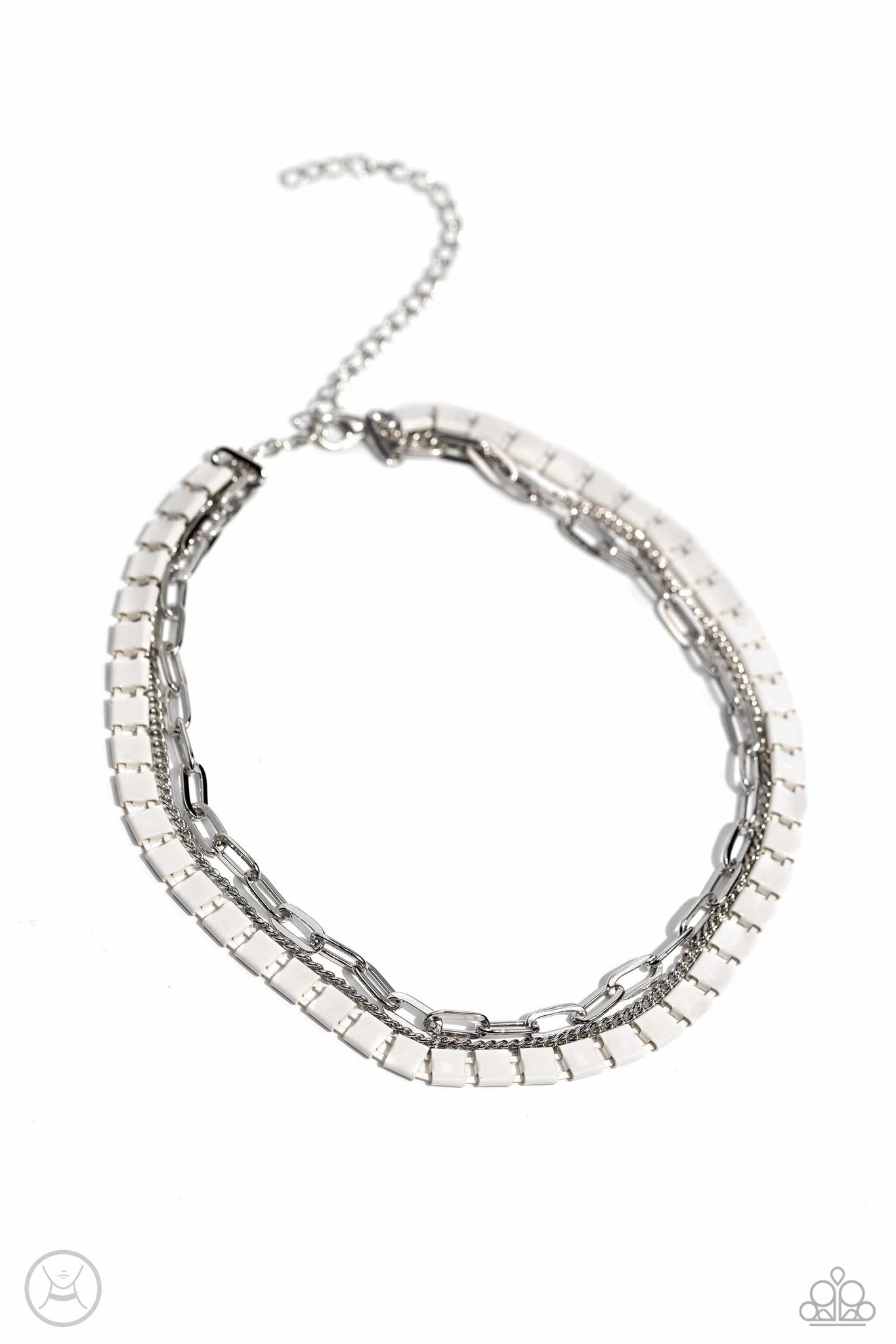 A medley of silver chains is joined by a strand of interlocking squares that are dipped in a vibrant white hue for a vibrant pop of industrial color around the collar. Features an adjustable clasp closure.