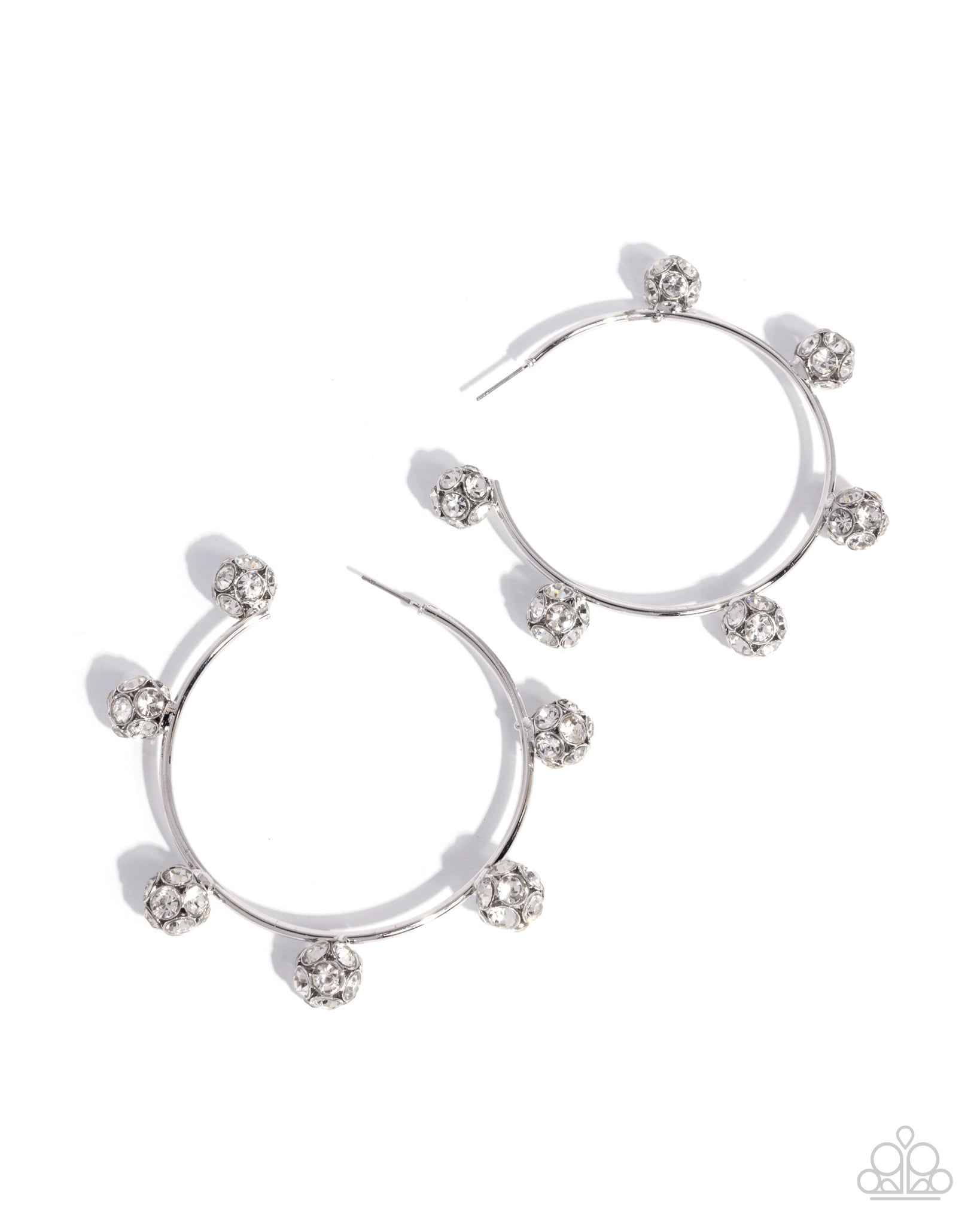 Dusted in white rhinestones, a classy collection of silver ornaments sporadically dot along the outside curve of a shiny, silver hoop for a radiantly posh finish. Earring attaches to a standard post fitting. Hoop measures approximately 3" in diameter.