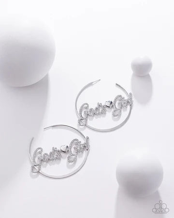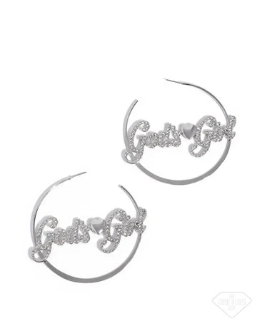 Dusted in sparkling white rhinestones, the phrase "God's Girl" in a script-inspired serif font accented with a sleek silver heart between the two words goes across the center of a sleek silver hoop, creating a radiantly refined reminder and eye-catching look. Earring attaches to a standard post fitting. Hoop measures approximately 3" in diameter. Sold as one pair of hoop earrings.